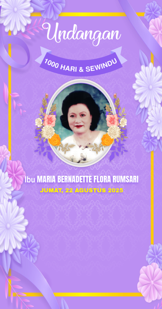 . . . Kepada Yth Bpk/Ibu/Saudara/i Tamu Undangan Buka Undangan Ibu MARIA BERNADETTE FLORA RUMSARI (22 Agustus 2017 – 18 Mei 2020 – 22 Agustus 2025) 00HARI 00Jam 00Menit 00Detik Dengan penuh kasih dan hormat, Kami mengundang Bapak/Ibu/Saudara/i untuk berkenan hadir dalam acara Mengenang: Berpulangnya : Ibu MARIA BERNADETTE FLORA RUMSARI (✝ 22 Agustus 2017 […]